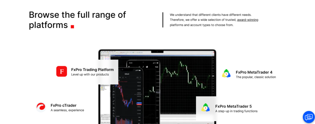 Hereby, FxPro offers you MetaTrader 4, MetaTrader 5, FxPro Platform and cTrader.