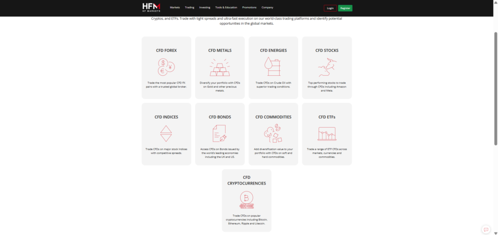 HF Markets covers many of the most popular financial markets, including 50+ currency pairs, metals, energies, shares, indices, bonds, commodities, stocks DMA, and ETFs.