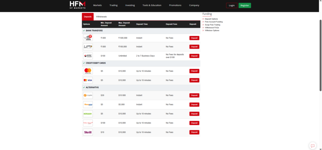 Existing users can deposit money into their accounts through wire transfers, credit and debit cards as well as Skrill and Neteller. There is no transfer limit, but credit and debit cards are limited to $15,000 while Skrill and Neteller are $10,000. HF Markets will reimburse traders for the incoming wire fee charged by their bank on deposits above $250. The withdrawal method must use the same method as the deposit, with a minimum amount of $150 for wire transfers and $5 for other options.