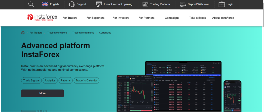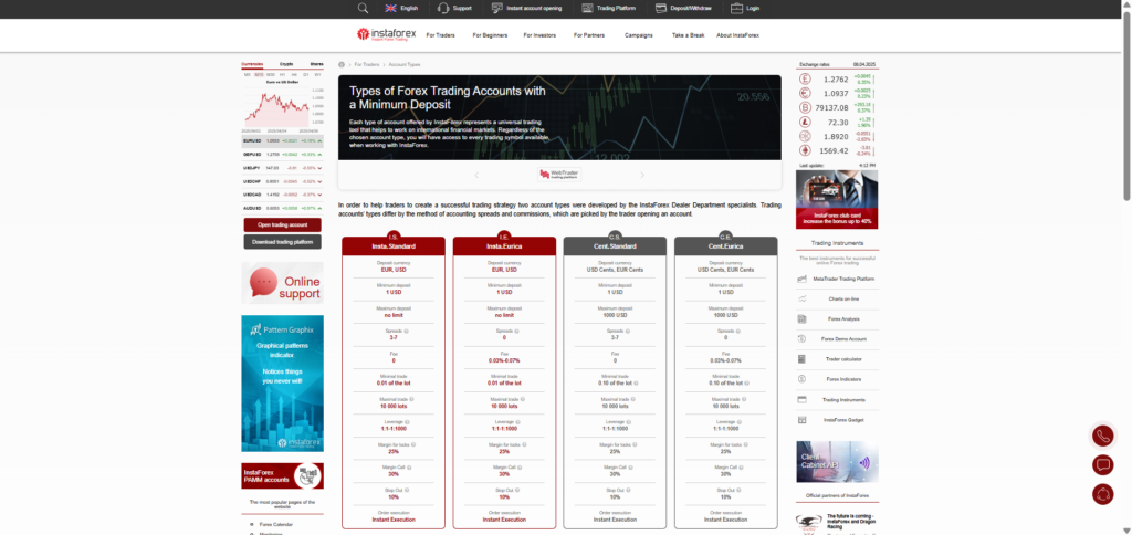 InstaForex offers tradable instruments across Forex, CFDs, commodities, and cryptos: