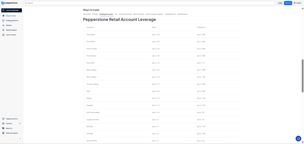 - In CySEC, FSCA, and BAFIN licensed subsidiaries, Pepperstone offers maximum leverage of 1:30 for retail traders and 1:500 for professional.