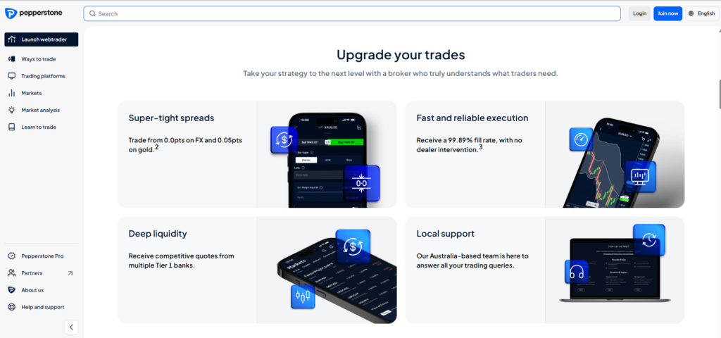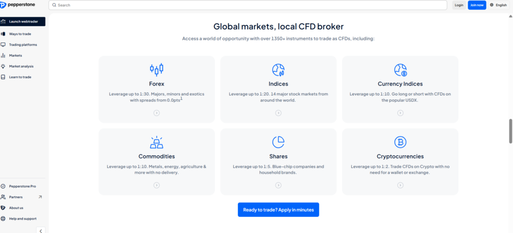 Pepperstone offers CFD trading in forex, commodities, stocks, and cryptocurrencies (depending on the region):
