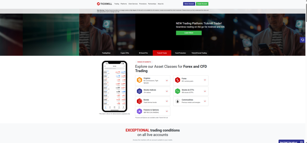 - Tickmill Trader: Tickmill Trader is a mobile trading platform that allows you to trade 24/7 with leverage up to 1: