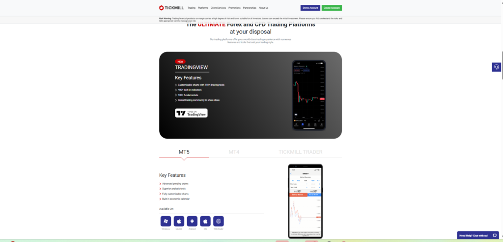- MT4: The MT4 trading platform is known to be up-to-date and popular in a world-class trading environment. Despite its advanced capabilities, third-party plugins are required to unlock its full functionality. Unfortunately, Tickmill only offers the most basic version of the MT4 platform.